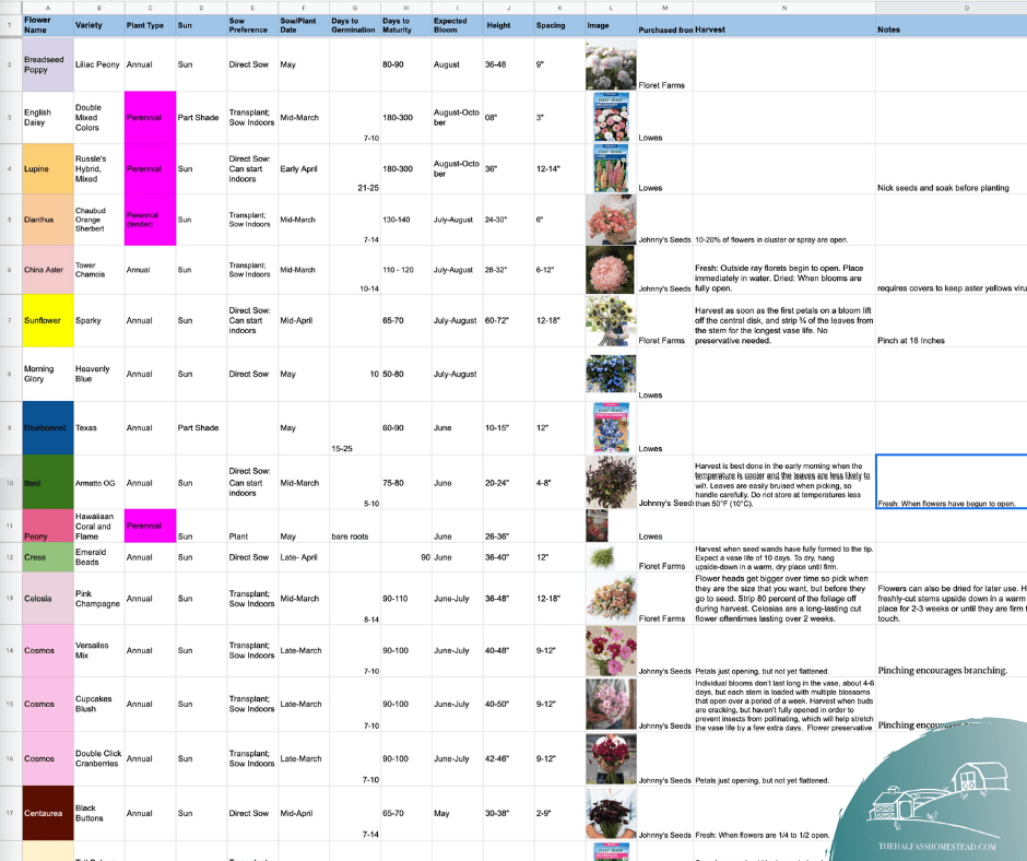 First, I decided I needed an info sheet for with all the basic information on each plant I’ve got for the garden, including planting/seed sowing preferences, bloom, height, and harvest time. This way I could determine where to place each plant so there’d be visual variety and plants wouldn’t overshadow their neighbors. I also added an image of each plant, so I could picture the adult plant and consider color.