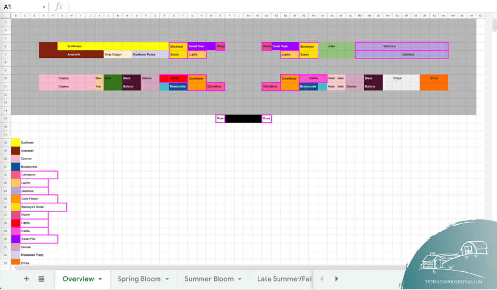 I then created another sheet with the layout, considering the height and spacing for each plant, and marked which plants were perennials–so I knew where plants would be coming back each year and where I’d need to replant. Finally, I created a layout with bloom times as I want to have something blooming in each part of the garden from spring to fall.