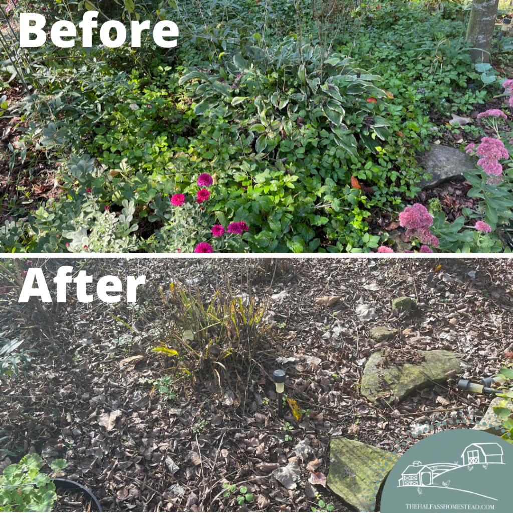I also haven’t touched the bed of hostas in front of the kitchen bay window yet but I plan to smother and cover that small bed. With my Japanese Maple in that bed, I don’t want to use any chemicals. Besides, the hostas are overgrown and can’t be divided because they’re infested with goutweed so removal or covering is the best option. I’ll cover it this winter and it’ll be fun to design a new perennial bed there in the spring–something that doesn’t have hostas maybe?
