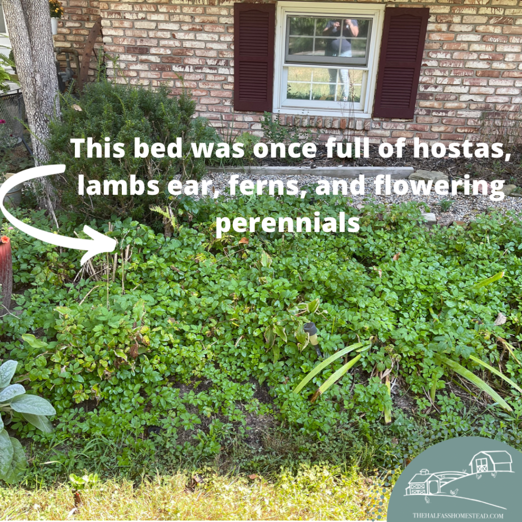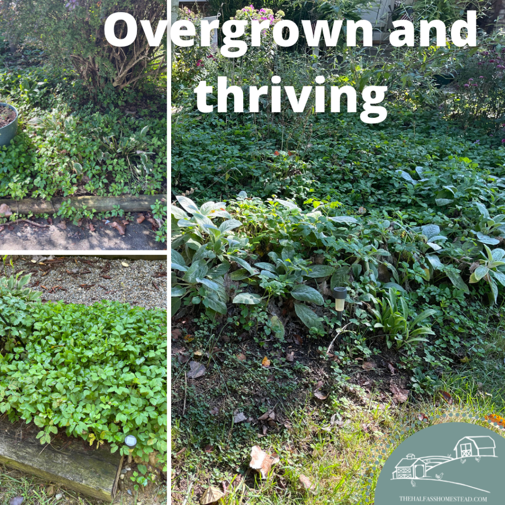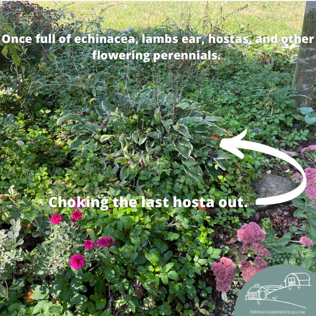 Since making this our home and taking over the gardens, I too now curse Kay’s mother-in-law every time I have to weed it out of the gardens. It doesn’t just cover the open, available real estate on the ground, it likes to hide in the middle of other plants–like my hostas, chrysanthemums, and russian sage–making finding them early and pulling a bitch. And despite my best back-breaking, weed-pulling efforts, it seems to come back with more vehemence each time. I’m telling y’all this stuff could flourish in a vat of bleach with no light.