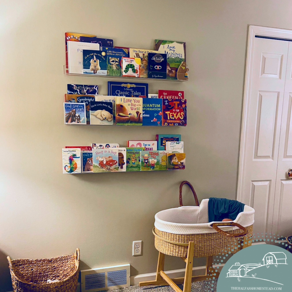 Y’all. This nursery has come along WAY slower than I would like. Partly because I either don’t have energy, can’t make a decision, or I’m waiting on someone or something. Anyway T-minus 23 days and it’s ALMOST done. Possibly the most exciting thing, these acrylic floating shelves for books.